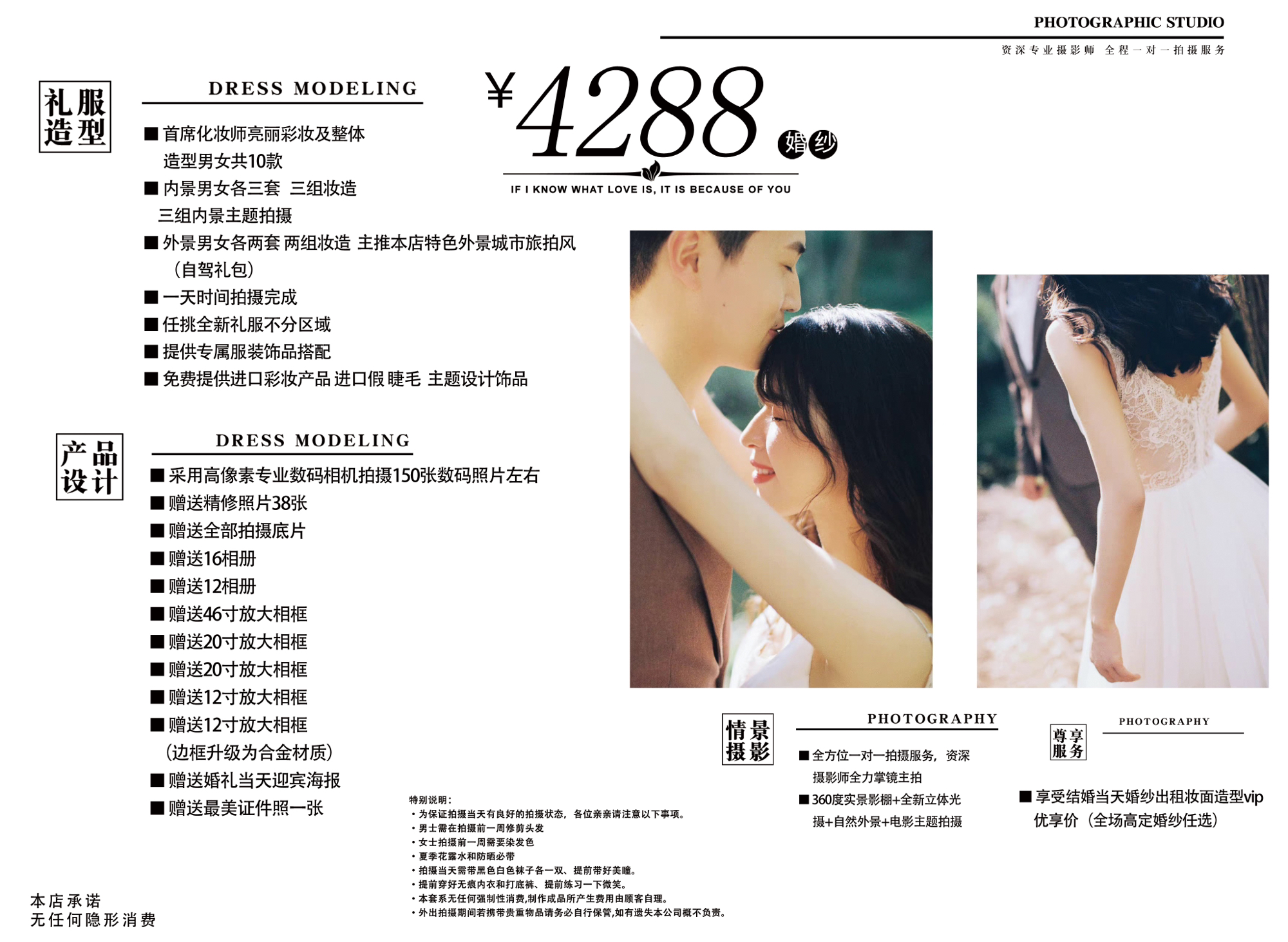 1.拍摄时请保持愉快的心情 2.建议不要携带过多的贵重物品,以免丢失。 3.头一天晚上避免饮用过多的水,以防眼睛浮肿 4.建议女生前一天洗头,但不要使用护发素,睡前一定记得吹干 5.如有要求,可以随时沟通。原则上只要我们可以做到都会满足。 6.当天支付拍摄尾款 7.我们擅长捕捉爱的瞬间,我们认为最美的样子就是您开怀大笑的样子。感谢您的选择,我们会尽心尽责,不留遗憾。 8.愿拍摄合作开心,留下一次美好的记忆。