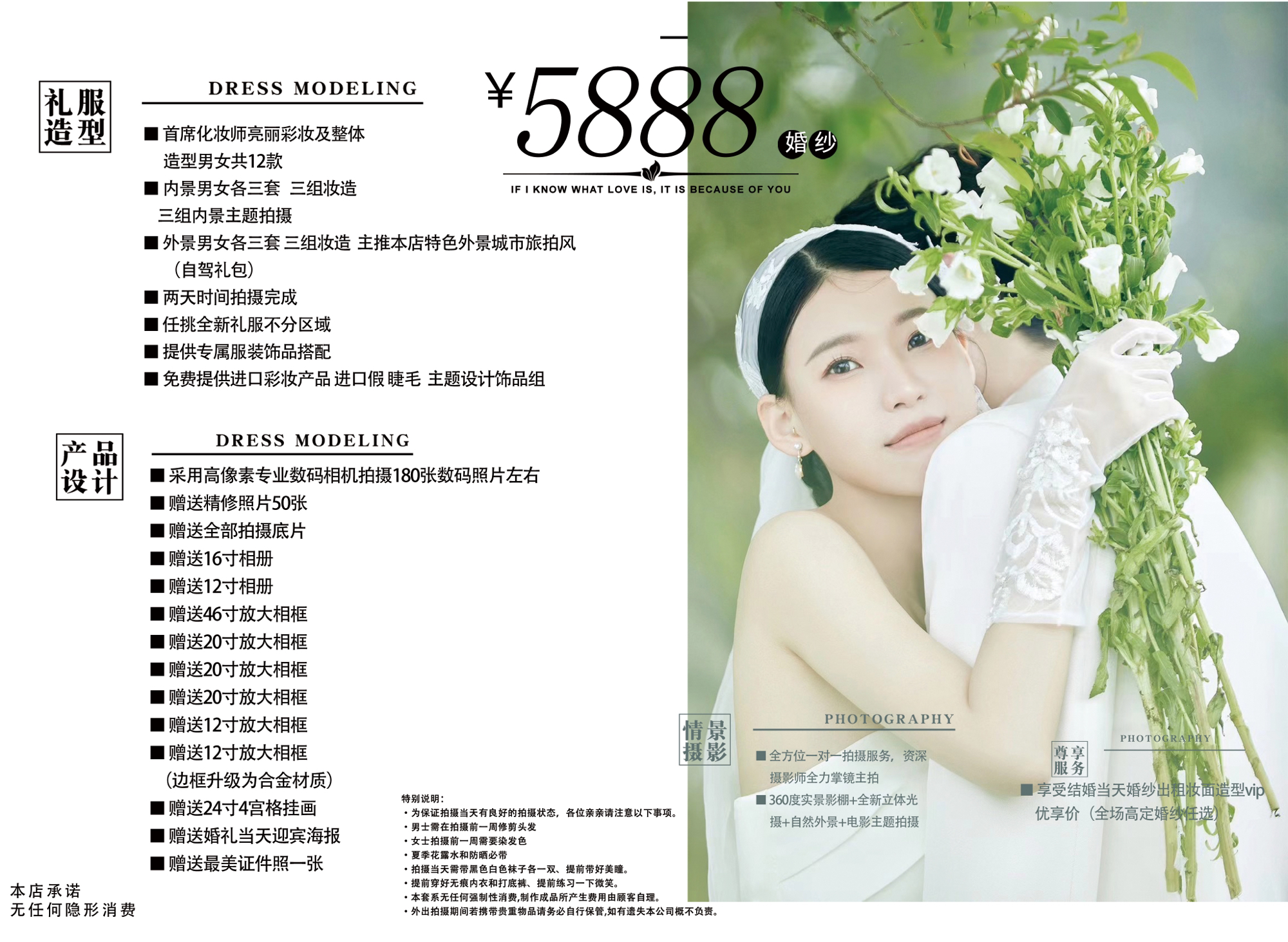 1.拍摄时请保持愉快的心情 2.建议不要携带过多的贵重物品,以免丢失。 3.头一天晚上避免饮用过多的水,以防眼睛浮肿 4.建议女生前一天洗头,但不要使用护发素,睡前一定记得吹干 5.如有要求,可以随时沟通。原则上只要我们可以做到都会满足。 6.当天支付拍摄尾款 7.我们擅长捕捉爱的瞬间,我们认为最美的样子就是您开怀大笑的样子。感谢您的选择,我们会尽心尽责,不留遗憾。 8.愿拍摄合作开心,留下一次美好的记忆。
